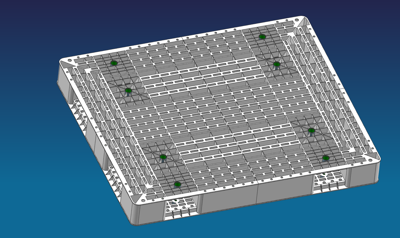 針對現(xiàn)有1400×1200×150mm塑料托盤適用于食用菌工廠化企業(yè)載重大堆碼高,由于托盤自身結(jié)構(gòu)造成叉車進叉舉升后下彎變形造成塌垛無法使用現(xiàn)象,新型1400×1200×150mm塑料托盤將1400mm方向中間支撐部位由原有的420mm加大至656mm,兩個進叉口由原來的245mm縮小至180mm,兩邊支撐位由原來的245mm縮小至192mm,使得新塑料托盤的進叉口縮小的同時向外挪移,叉車叉臂進叉舉升時正好處于上部三個周轉(zhuǎn)箱1號和3號箱的中間部位,起到了很好的舉升承重作用同時最大限度的減少了托盤的下彎變形,很好的解決了在使用過程中出現(xiàn)的因下完變形造成的塌垛現(xiàn)象。