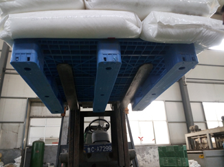 上圖為:托盤載重1500kg塑料原料側(cè)面舉升狀態(tài),塑料托盤沒有彎曲前傾現(xiàn)象